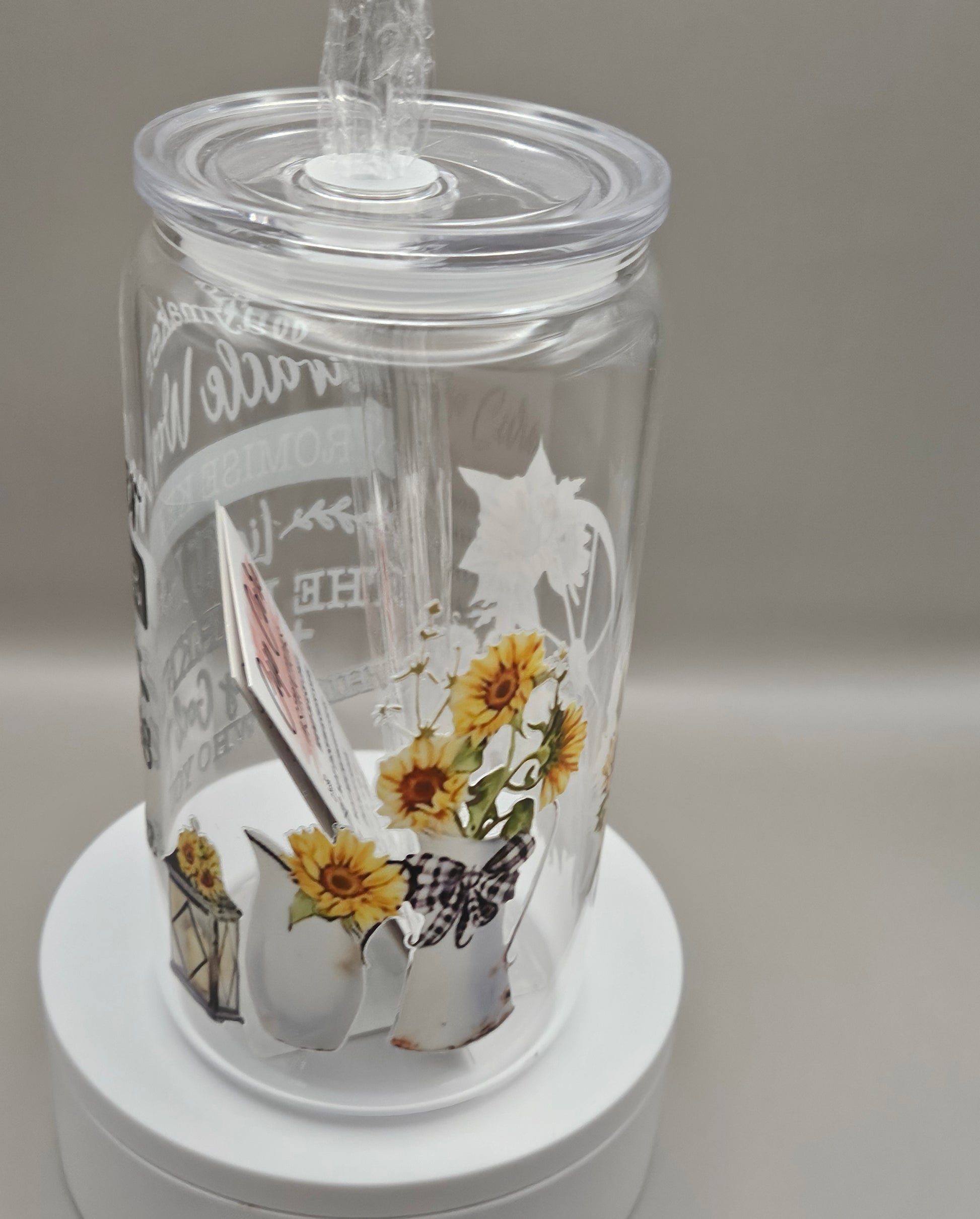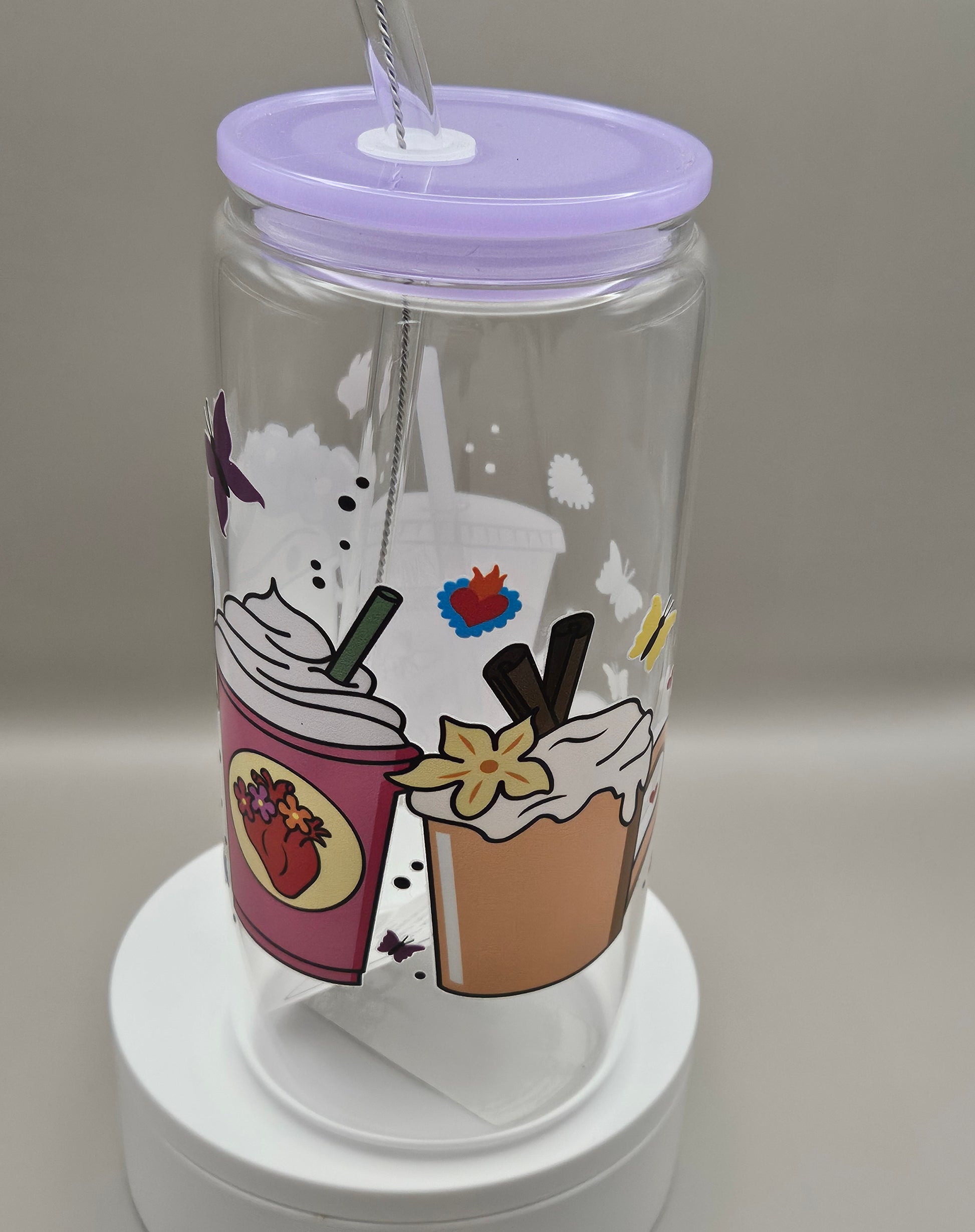 This glass cup is perfect for anyone who wants to enjoy their favorite beverages in style. It holds 16oz hot or cold, is made with durable glass, and features an acrylic lid with a reusable glass straw accompanied by a straw cleaner! Enjoy your drinks with an extra special touch!